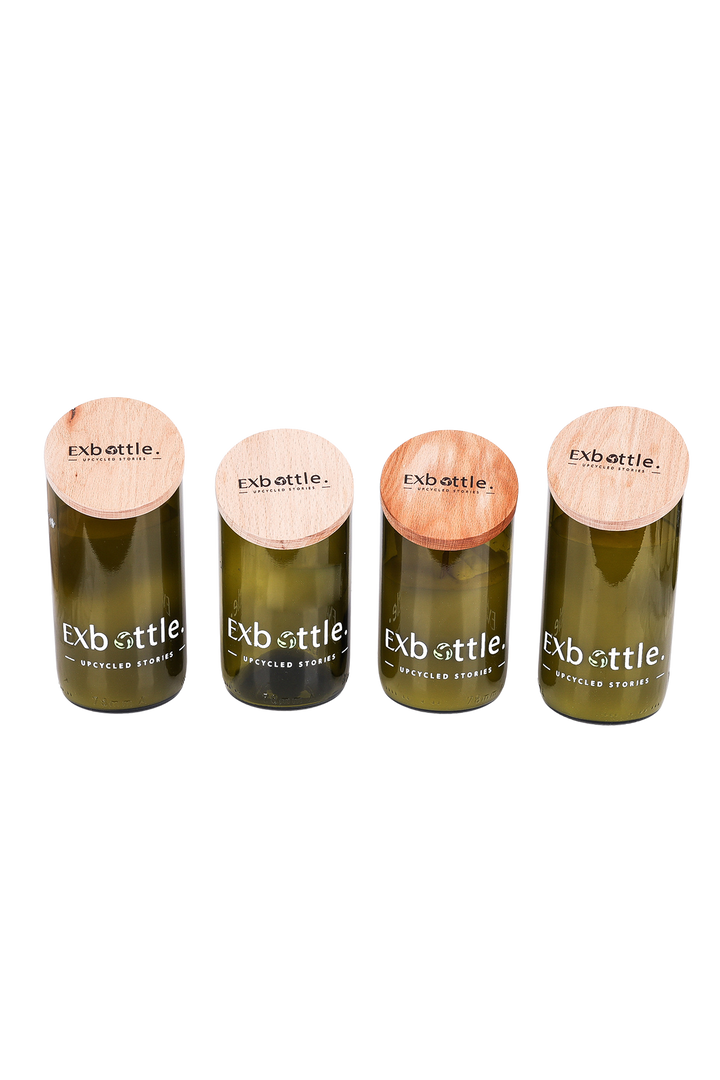 The Exbottle Slanted-Cut Quartet Set starts as four artisanal candles and continues its journey as versatile, reusable glass pieces for your home. Each vessel, handcrafted from upcycled glass bottles, features Exbottle’s signature slanted-cut rim and smooth natural wooden lid, elegantly arranged on a solid pine tray.