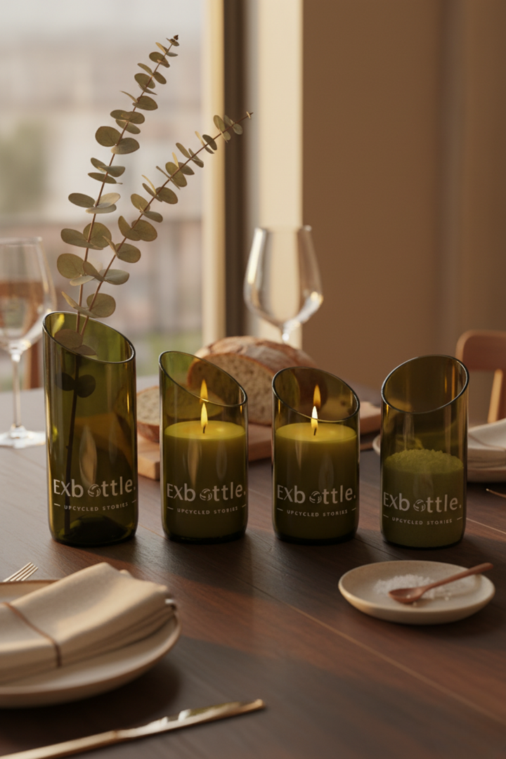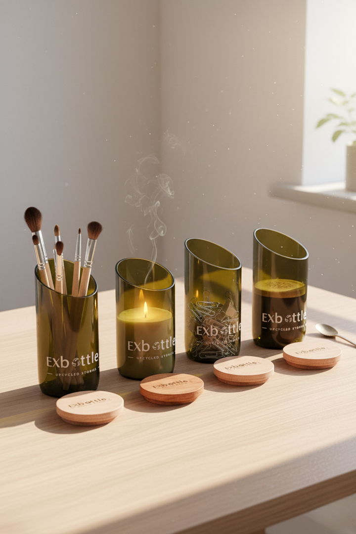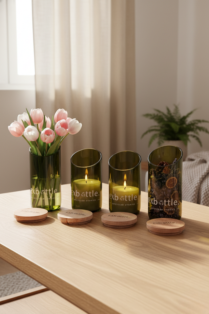 Exbottle Slanted-Cut Upcycled Quartet Set — Handcrafted Candle, Vase, Tumbler & Decorative Storage Set