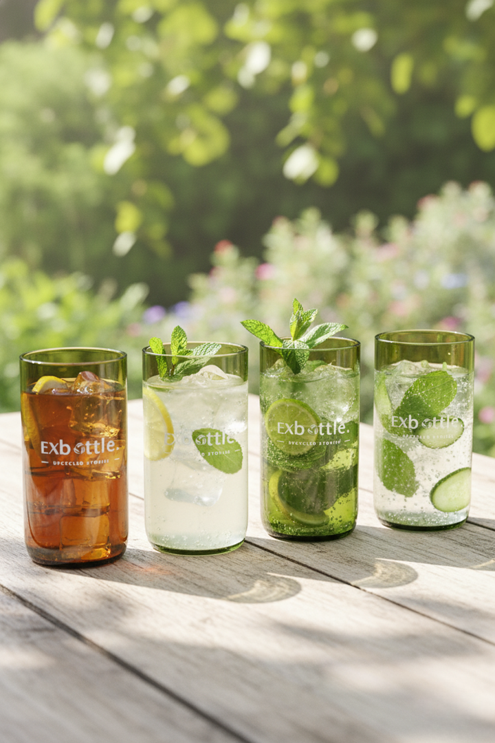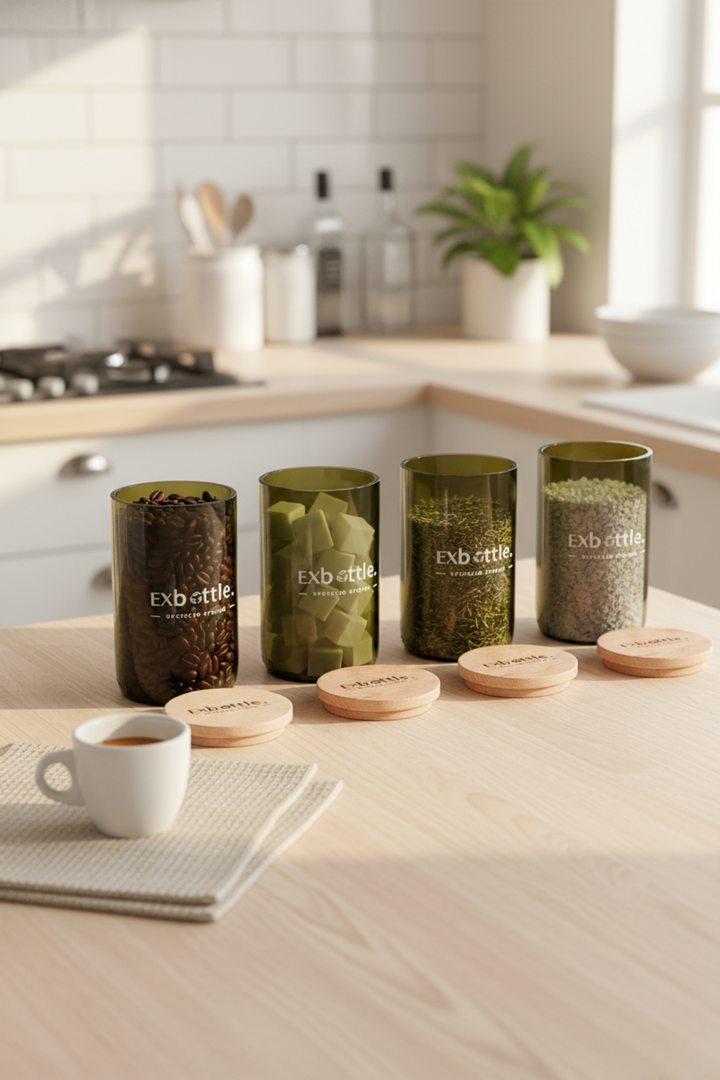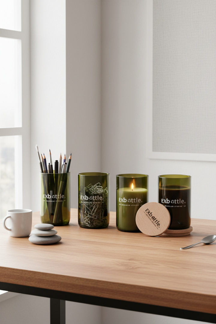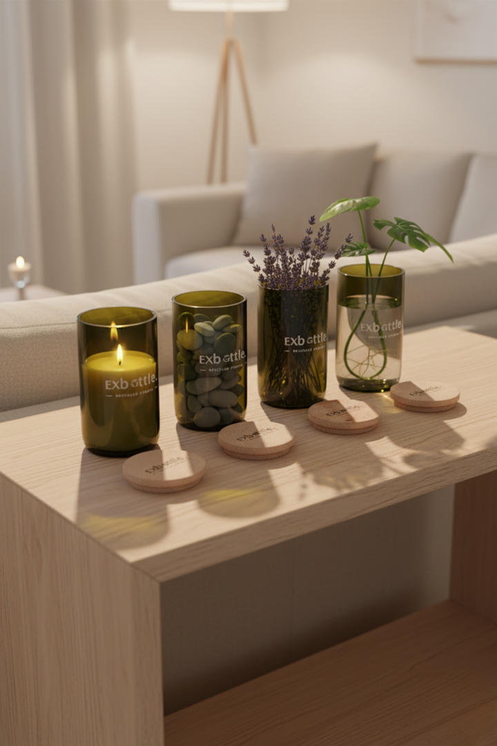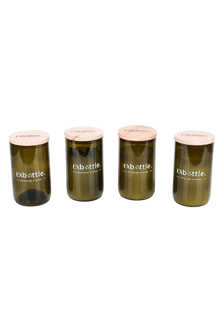 Exbottle Straight-Cut Upcycled Quartet Set — Handcrafted Candle, Vase, Tumbler & Decorative Storage Set